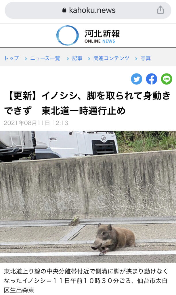 今朝、東北道の仙台南インター付近で、イノシシが中央分離帯付近の溝に後ろ足を落としてしまった様子。