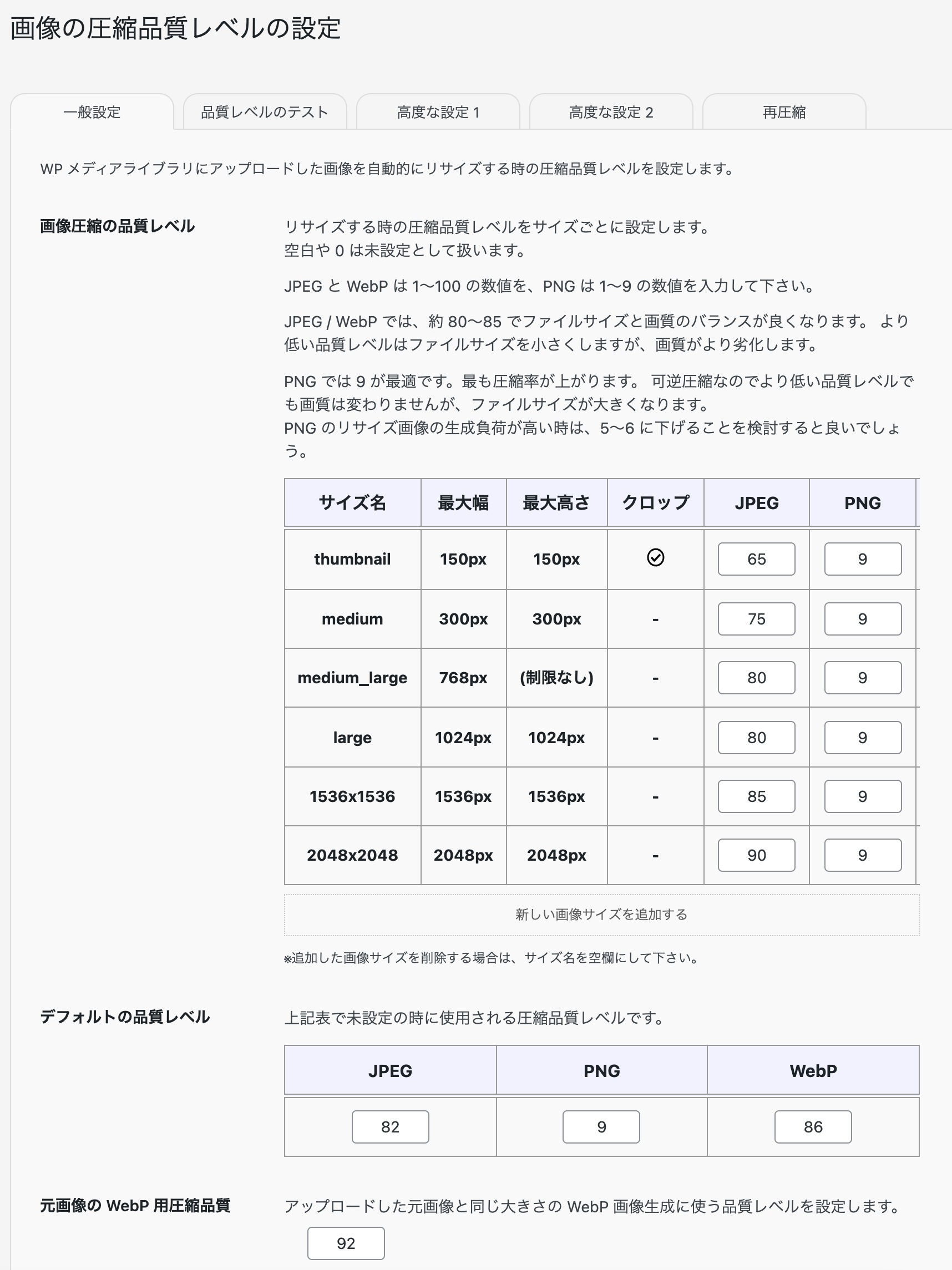 既存の画像も圧縮して欲しい場合は、このプラグインのタブの中で再圧縮を利用します。