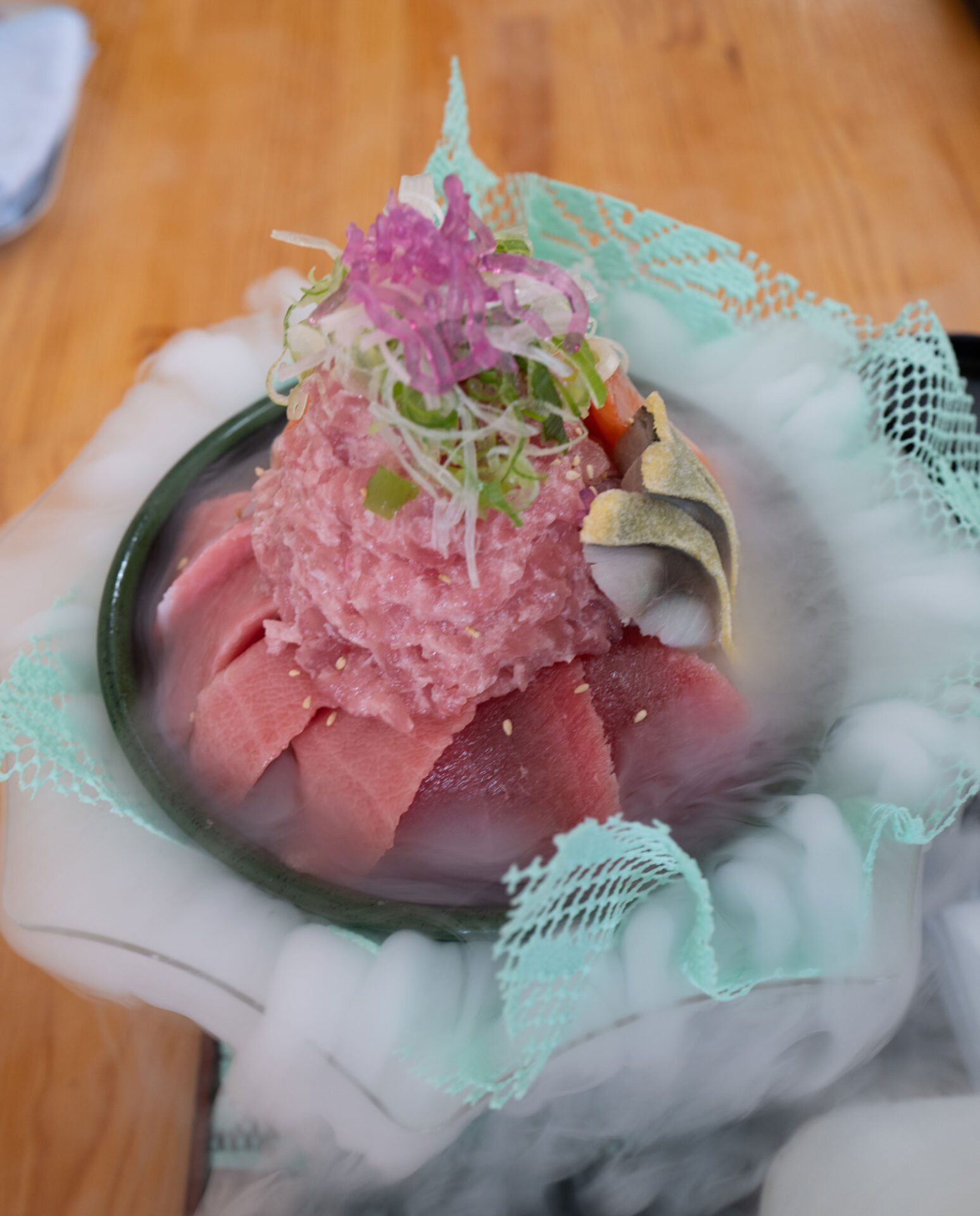 インスタ映えしそうなドライアイス煙モコモコな山ほこ丼です。