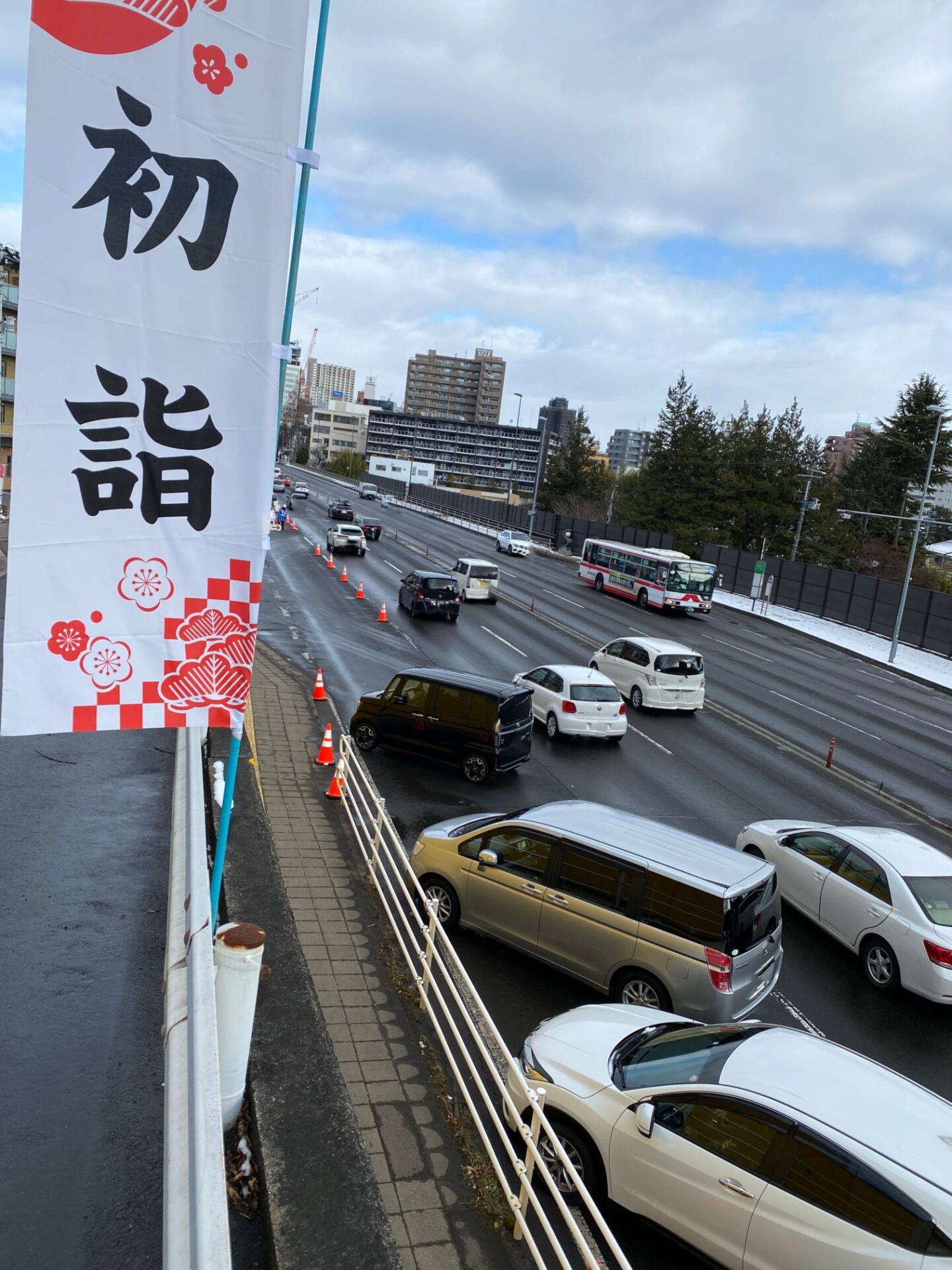 しかし、正月だけは大丈夫です。神社の麓の幹線道路(片側3車線)の内1車線が駐車場になるからです。