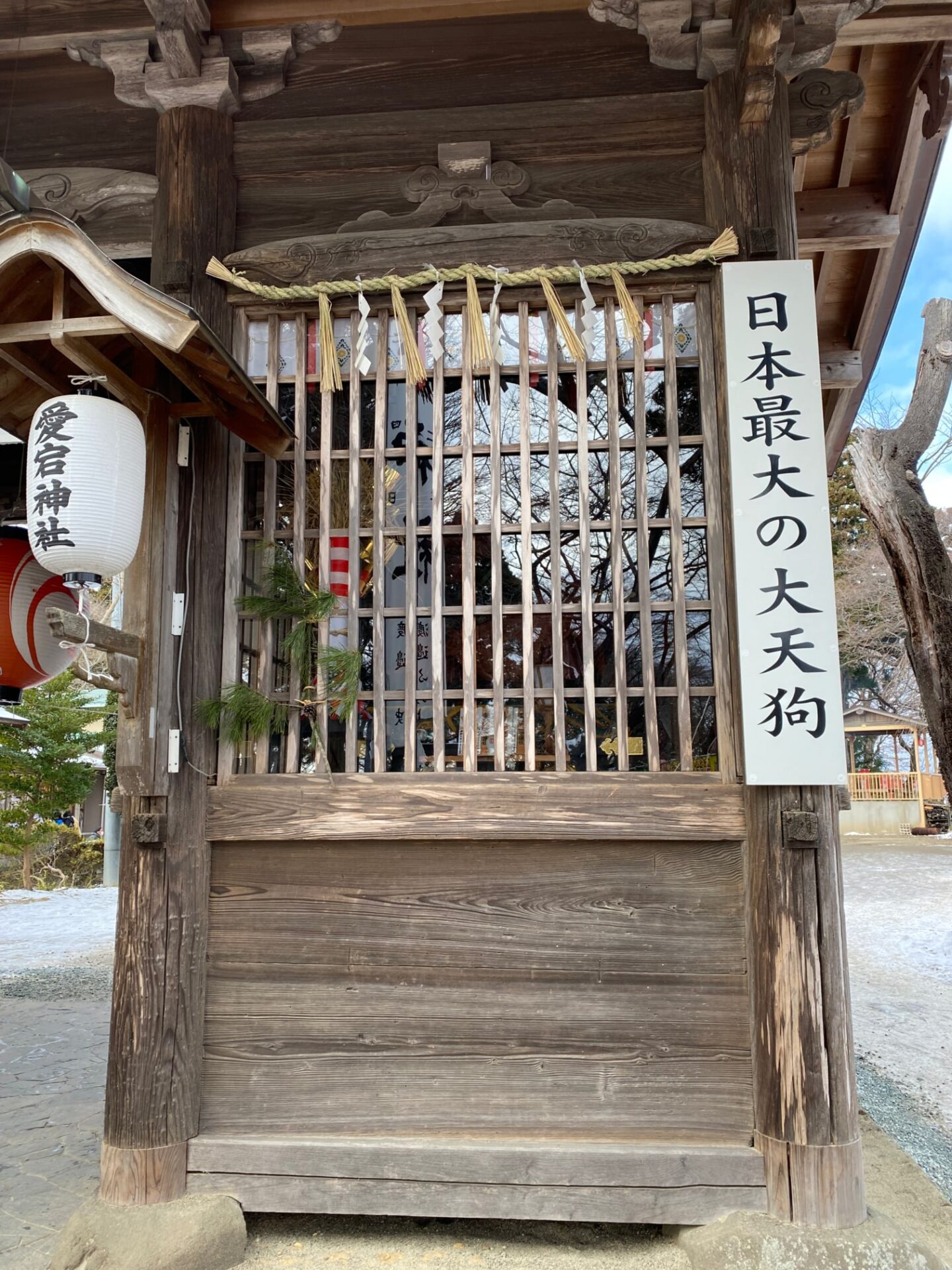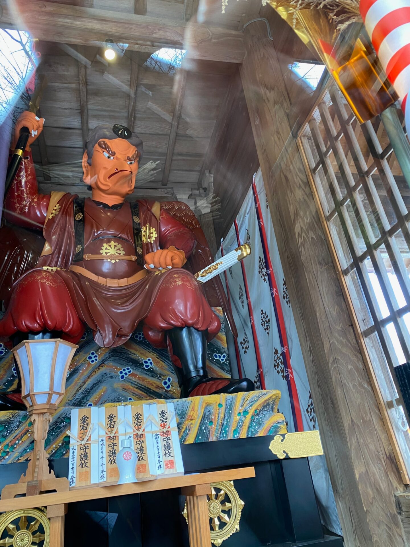 大天狗と言われてもガラスの反射でさっぱり見えませんが、ガラスから数センチにiPhoneのカメラレンズを寄せて撮影したら見えました。