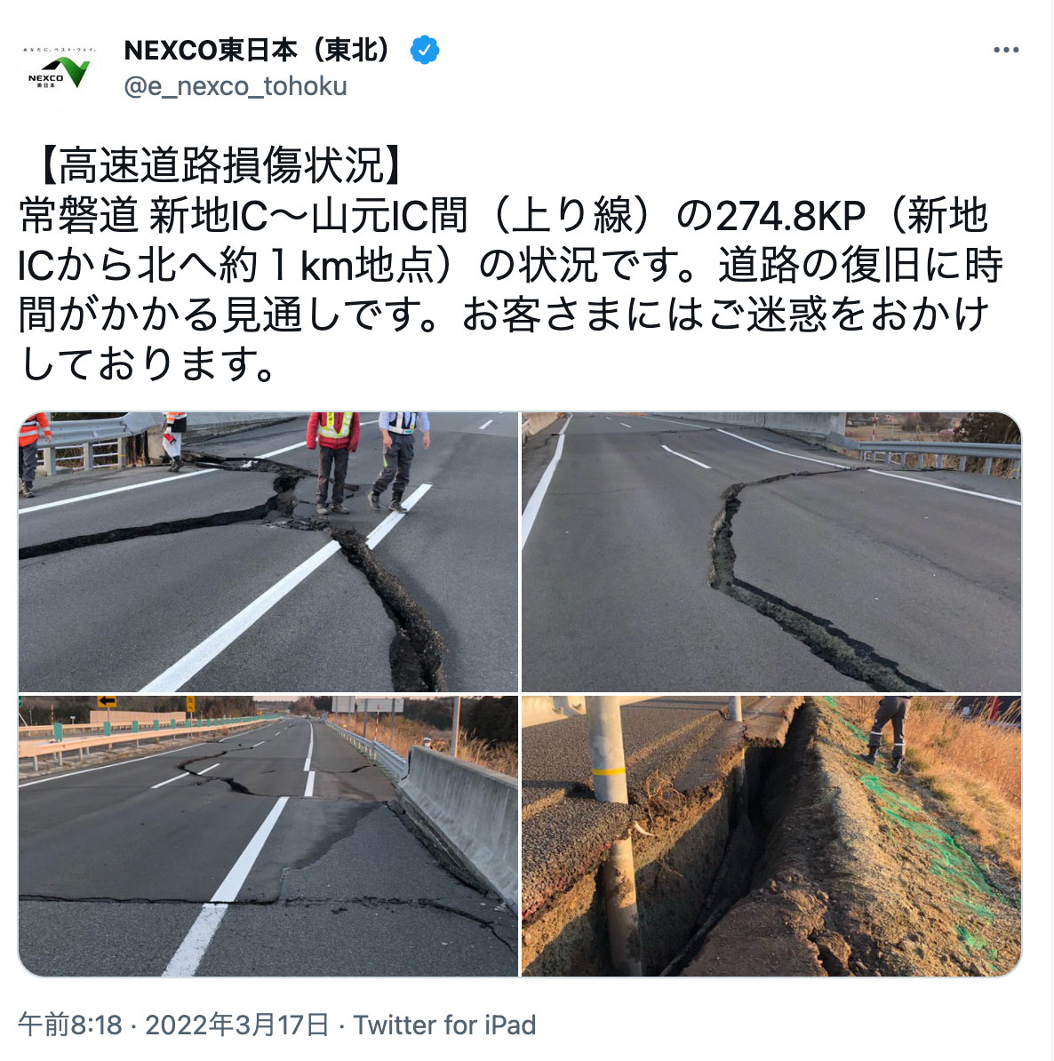 NEXCO東日本(東北)のTwitterより常磐道 新地IC~山元IC間(上り線)
