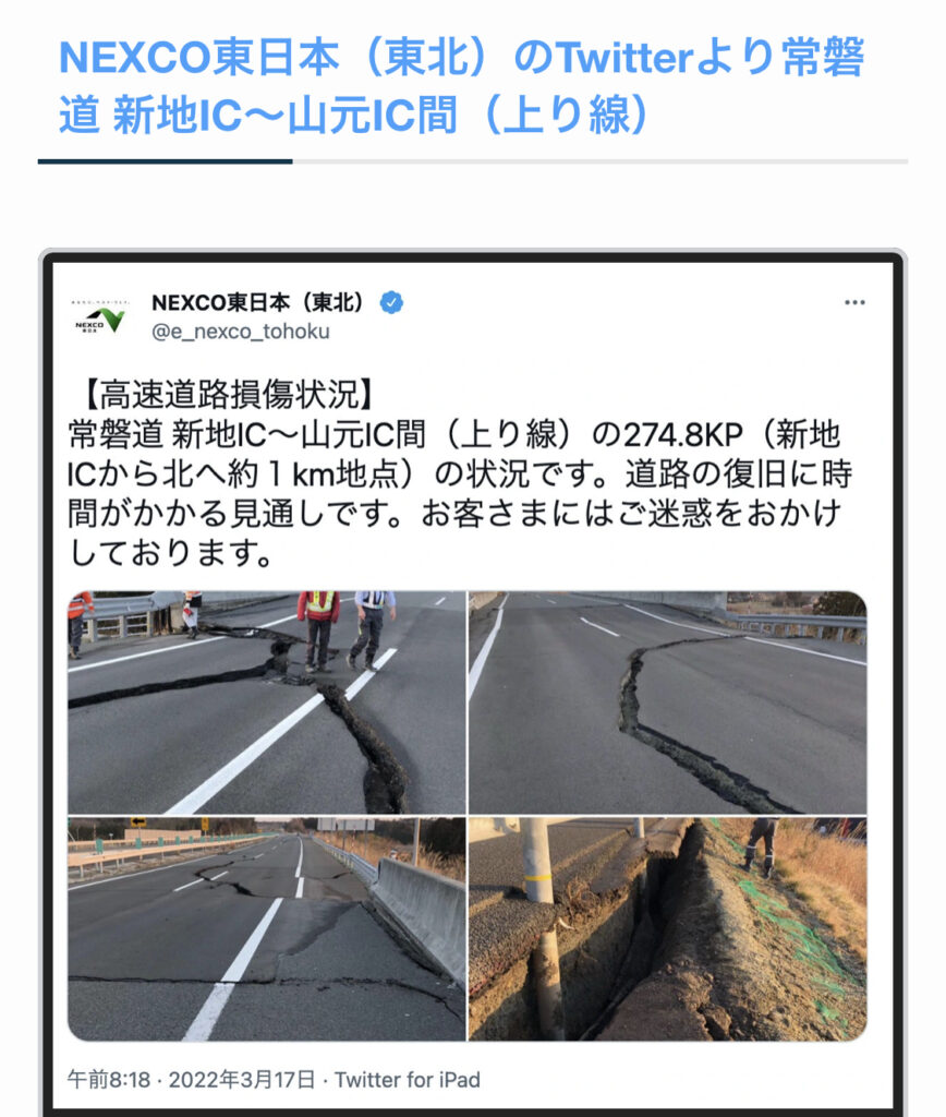 一昨日3/17ツイートした大地震で壊れた道路