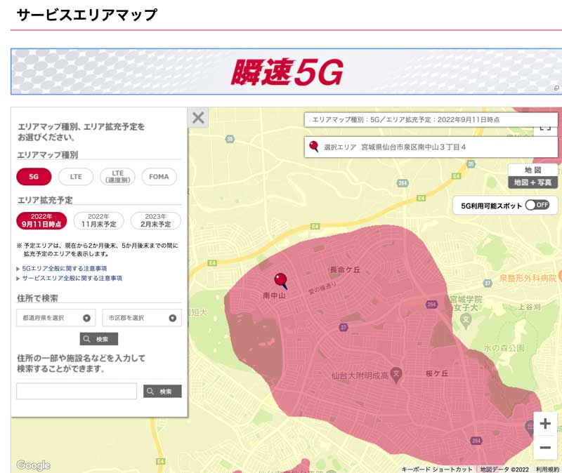 我が家のエリア(仙台市泉区南中山)は、政令指定都市なのに、長らく5G未対応エリアだったためでした。