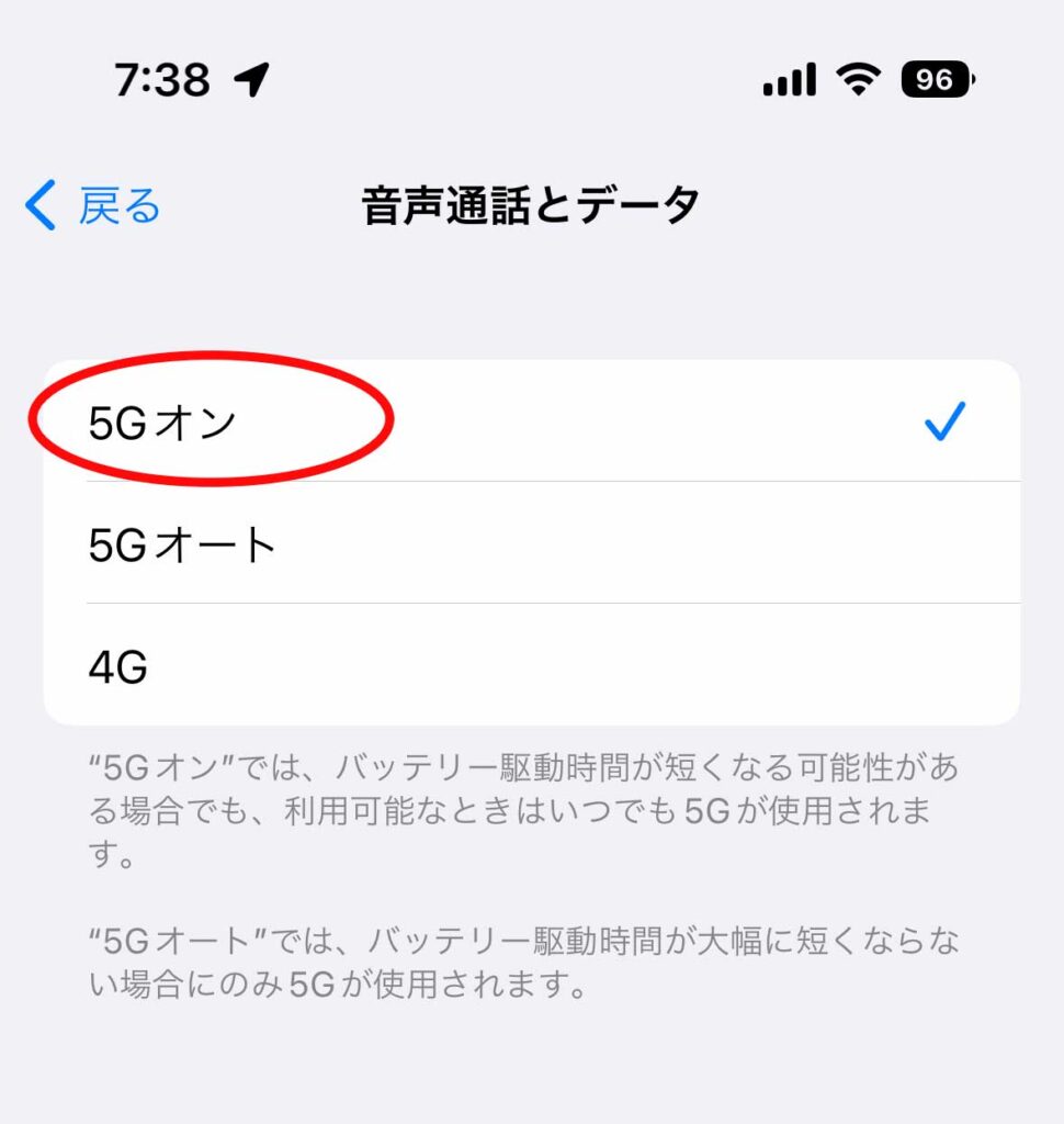 5Gオートではなく、5Gオン と言う箇所にチェックを入れました。