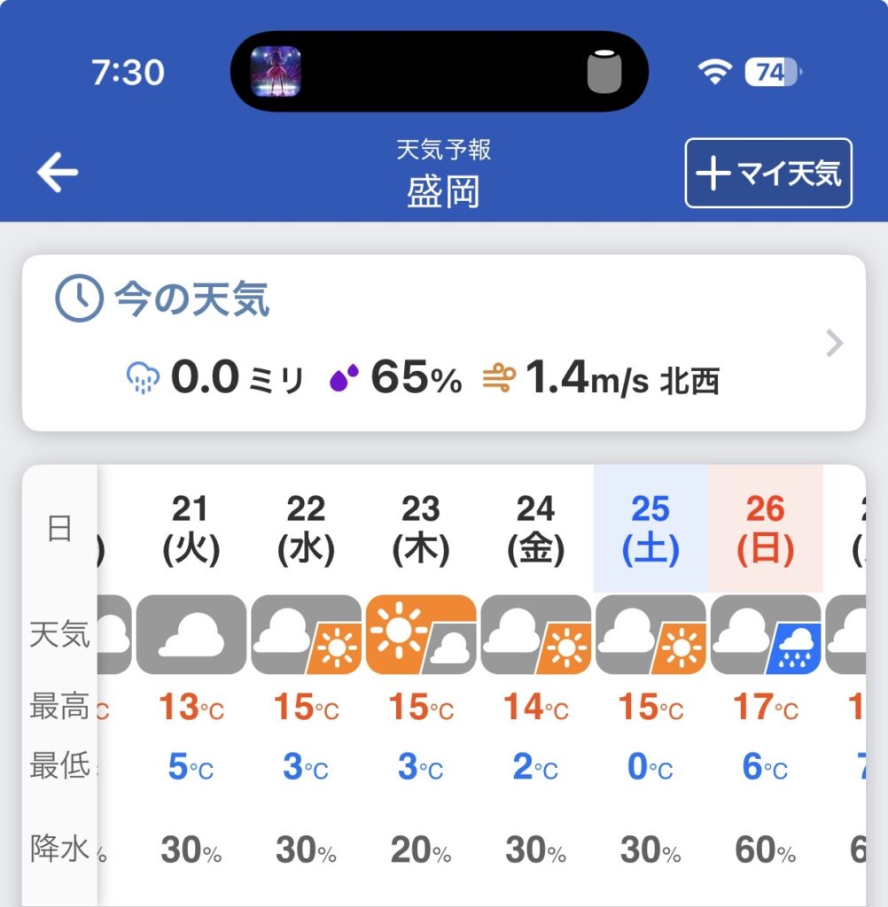盛岡あたりの長期予報を見てみると