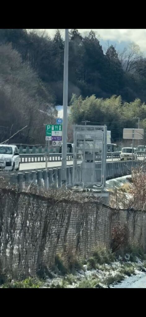 並走する一般道から撮影です。往復ともに撮影したので装置の面と裏の様子です。