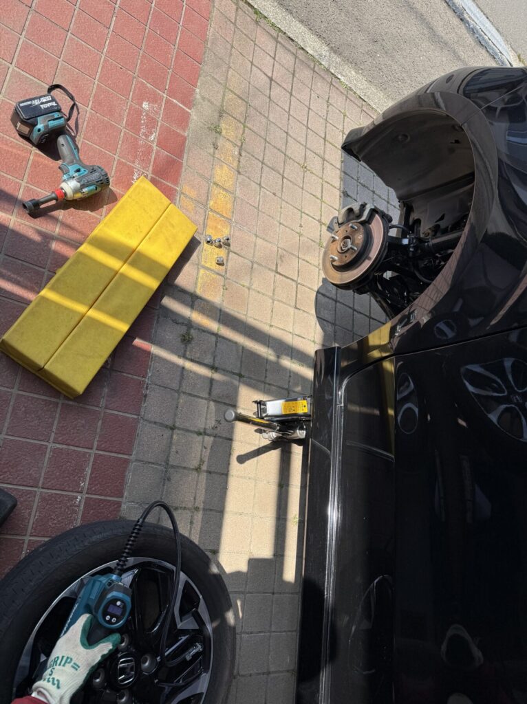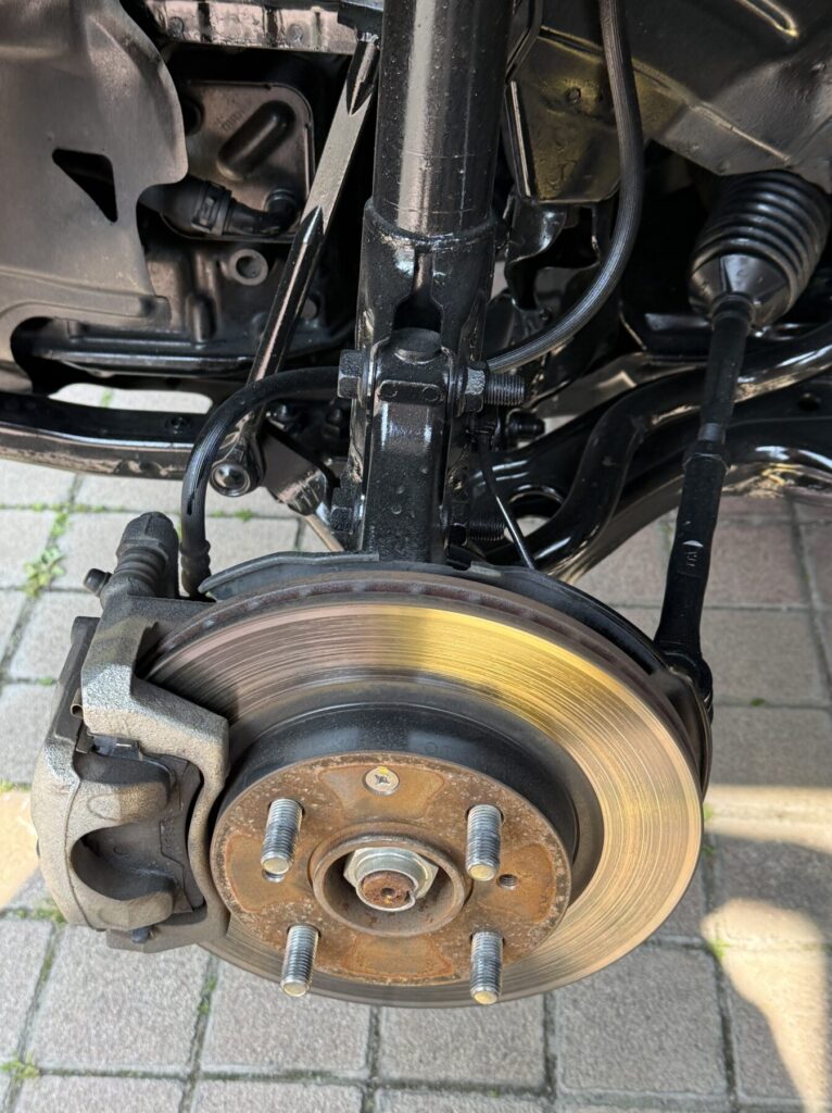 自分でタイヤ交換すると良い事は、普段は目につきにくい下回りをよく見る機会が得られます。ブラック塗装も綺麗でディスクローターも大丈夫です。